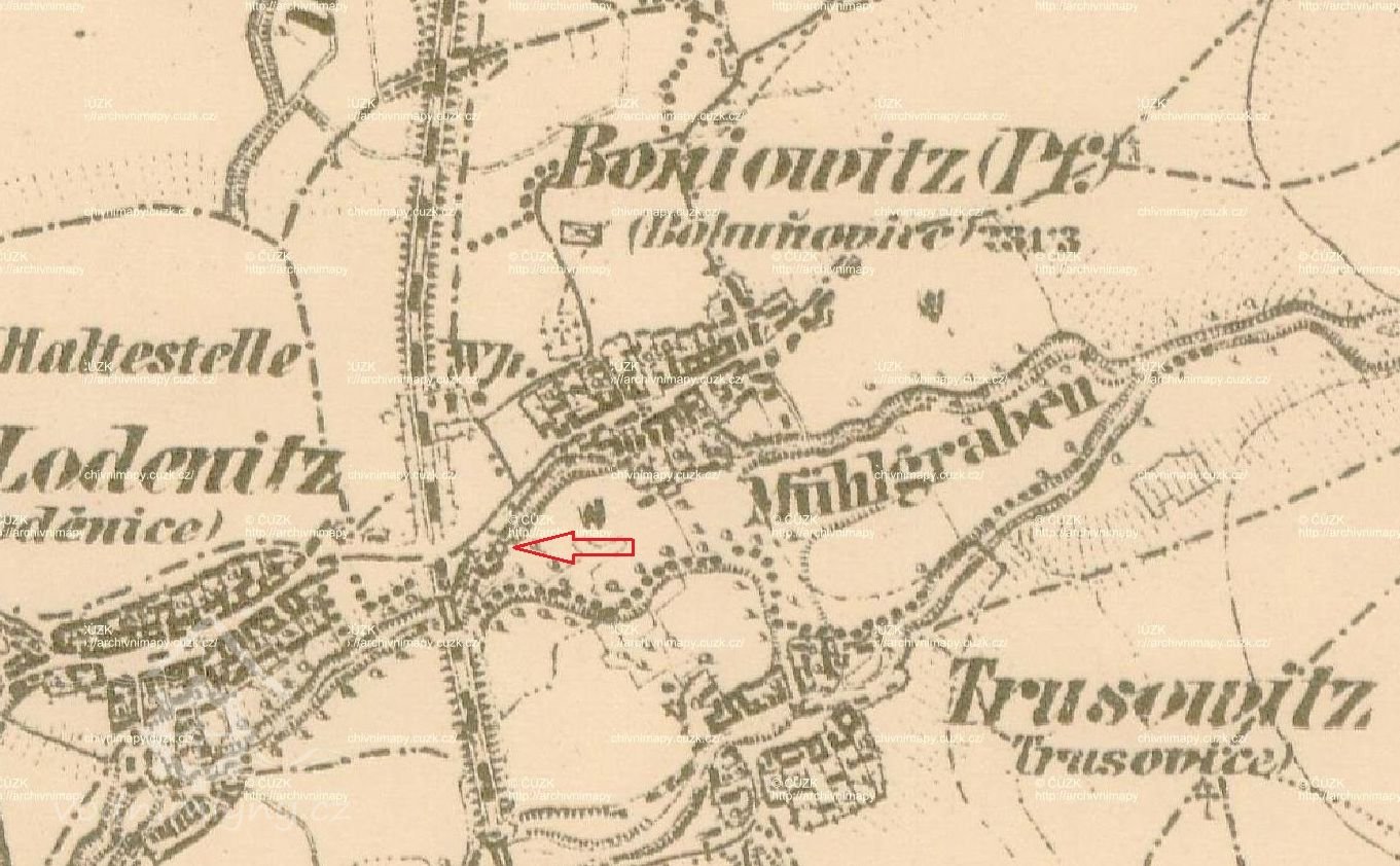 Roku 1797 koupil mlýn Jan Čajka (Mühlpursche von Boniowitz) od vrchnostenského úřadu c.k. komorního panství Hradiště za 1700 zlatých. Při mlýně bylo 61 měřic polí a 6 měřic 6 achtlů luk. Když se Čaja v r. 1799 ženil, přinesla nevěsta Kateřina Petrová z Hlusovic věna 400 zlatých.