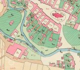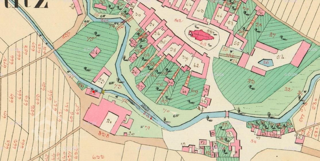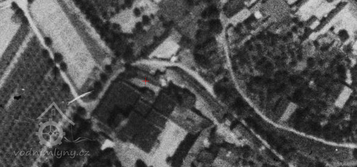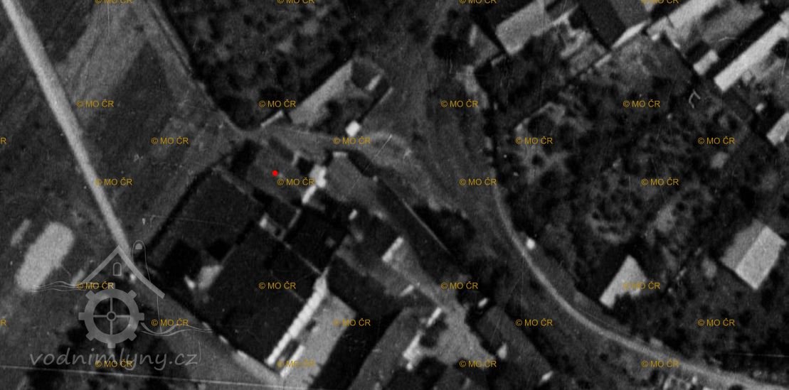 Mlýn se nachází za humny statků stojících na návsi jižně.