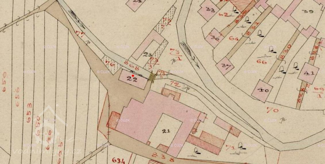 Popis1930: 1 kolo na svrchní vodu, hltnost 0,26 m3/s, spád 3,8 m, výkon 8,5 HP
