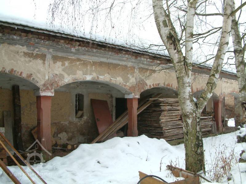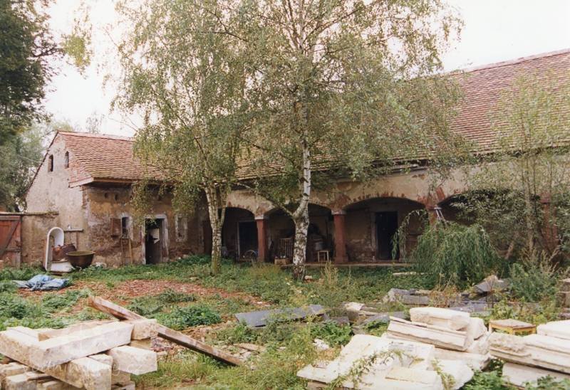 Hospodářský objekt se stájemi s arkádovým náspím se sloupy z červeného pískovce.