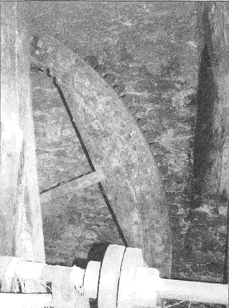 v suterénu torzo hřídele vodního koila, na konci okováno, na ose zavěšeno paleční kolo, prostřednictvím pastorku převádělo hnací sílu na kolmou hřídel.