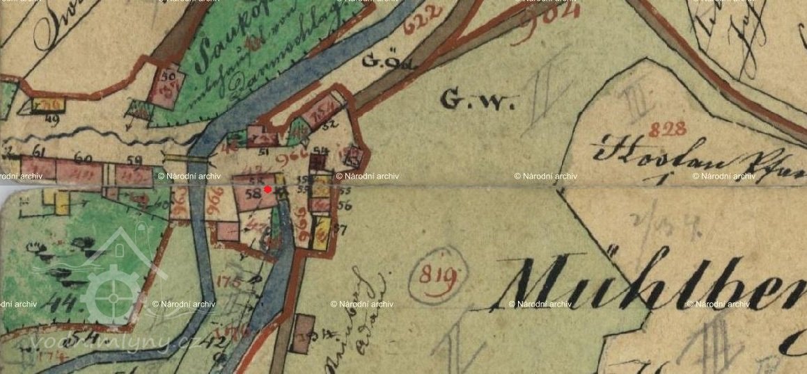 PopisRoku 1832 měl dvě kola na svrchní vodu. 1930 – mlýn a elektrárna – 1 kolo na svrchní vodu – 0,105-4,82-4,4.