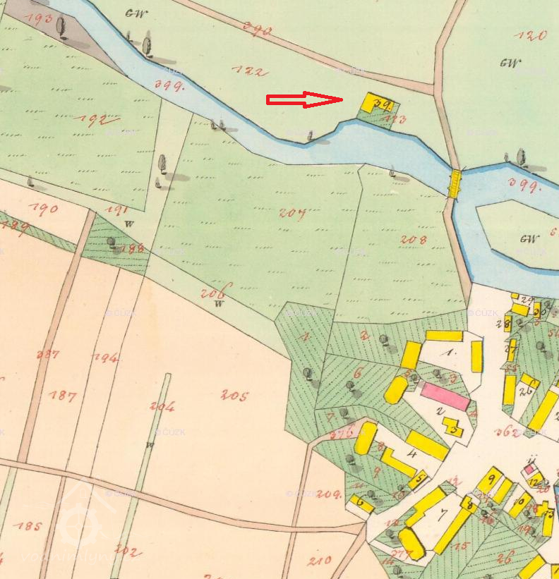 Popis1930: 1 kolo na spodní vodu, hltnost 1,51 m3/s, spád 0,8 m, výkon 6,5 HP