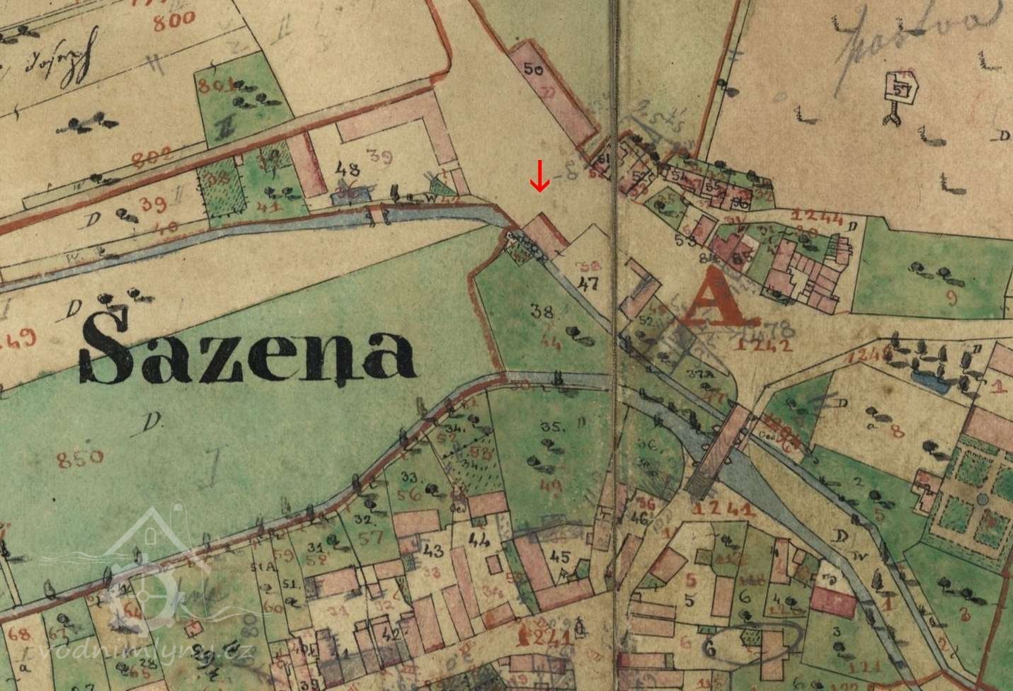 První zmínka o obci Sazená pochází z roku 1295.[i] Osídlení okolní krajiny je však již pravěké. O mlýnu prameny poprvé hovoří k roku 1544, kdy „Urban mlynář z Sazeného…“ koupil „…mlýn tu u vsi Sazenýho ležící“.[ii] Pozoruhodné zmínky pocházejí z let 1569 a 1577. V té době mlýn obýval mlynář Jan ze Sazené. Díky soudním sporům, které v těchto letech vedl majitel mlýna Gryspek z Gryspachu s panem Davidem Boryně ze Lhoty, jenž mu několikrát poničil náhon vedoucí k mlýnu v Sazené, se dozvídáme, že mlýn byl zděný, o dvou složeních a s doškovou střechou.[iii] Velkou ránou pro obec byla třicetiletá válka, po níž zůstaly „k roku 1654…jen 2 usedlosti osazené a 9 pustých“.[iv] Pro další osudy mlýna bylo velice důležité, že celou Sazenou i s hospodářským dvorem koupil v roce 1757 klášter premonstrátek v Doksanech, jehož představeným byl podnikavý opat Josef Václav Winkelburg.[v] Nechal totiž mlýn nákladně přestavět.