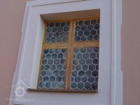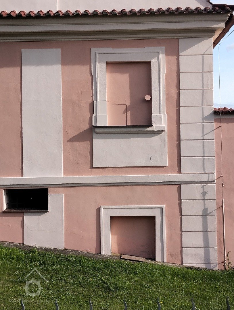 Zdivo patrně cihlokamenné, průčelí byla nevhodně opatřena tvrdými omítkami v nepříznivé barevné kombinaci.
