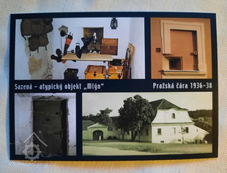 (DŽ ….) V roce 1938 byla do interiéru mlýna vestavěna pevnůstka československého stálého opevnění. Cituji z Pražská čára – vnější obrana Prahy: „… opevněné pásmo (pozn. DŽ: myšleno souvislé lehké opevnění na čáře Mělník – Vepřek – Slaný – Nižbor – Zadní Třebáň – Slapy, viz http://mapa.opevneni.cz/ I. sbor) procházelo na rozdíl od pohraničních úseků hustě obydlenými oblastmi. V některých případech měla být umístěna kulometná stanoviště improvizovaně do civilních budov … v případě obce Sazená se Ředitelství opevňovacích prací rozhodlo dvě civilní budovy (pozn. DŽ: jednou z nich je mlýn) podstatně upravit ku obrazu svému“ (… DŽ)