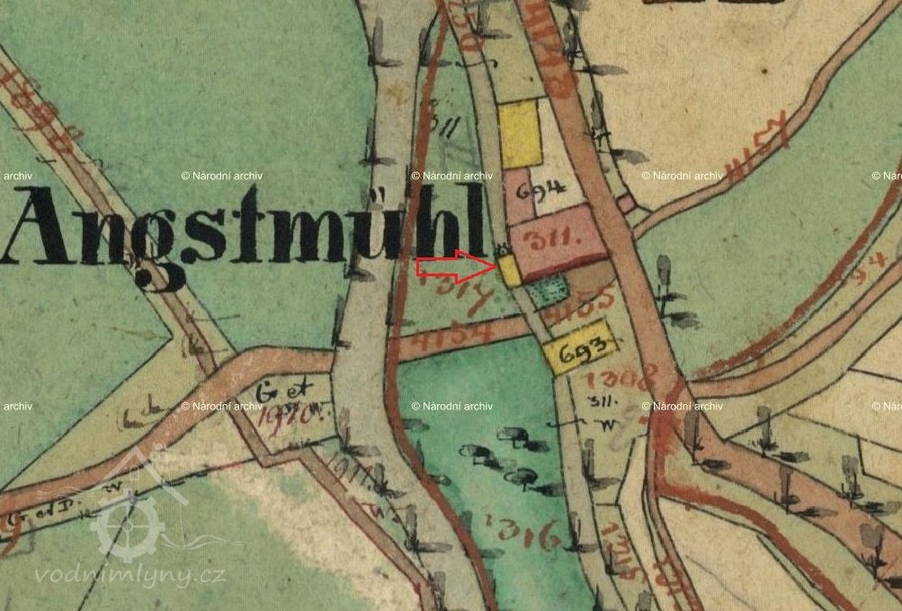 Nestarší zmínka o mlýnu je k roku 1568, kdy je zde uváděn mlynář Mathes Angstmühler. Mlýn je dále zapsán v tachovském urbáři z roku 1616.