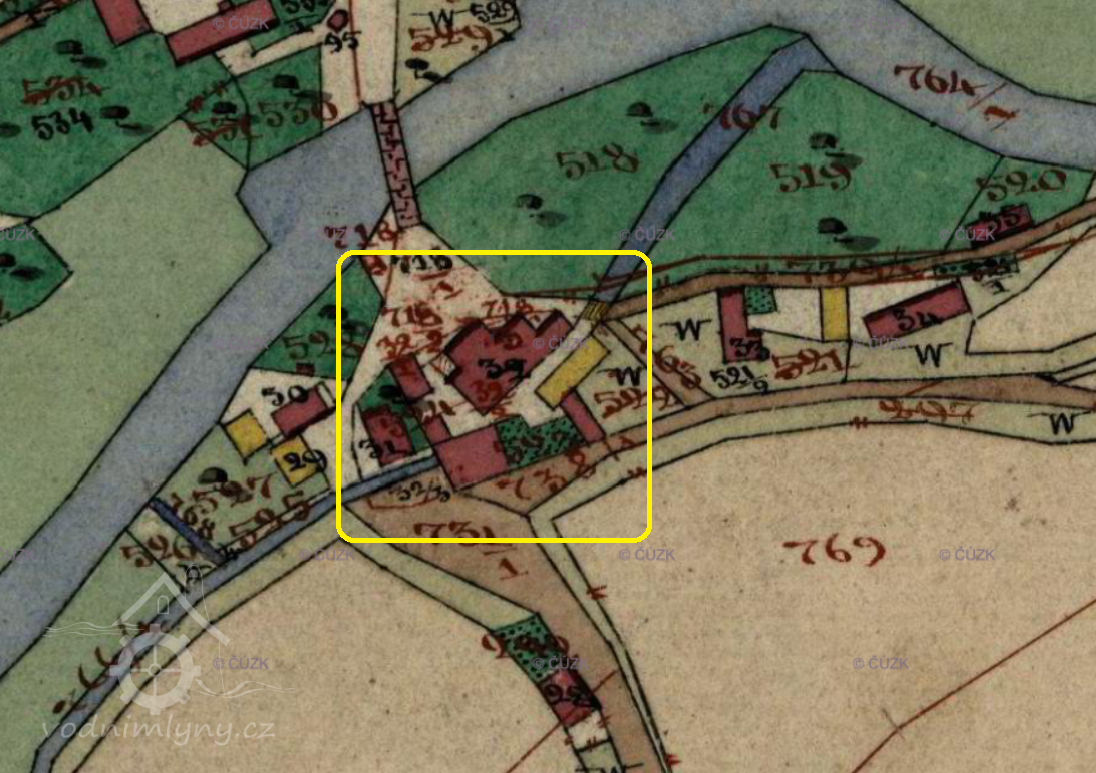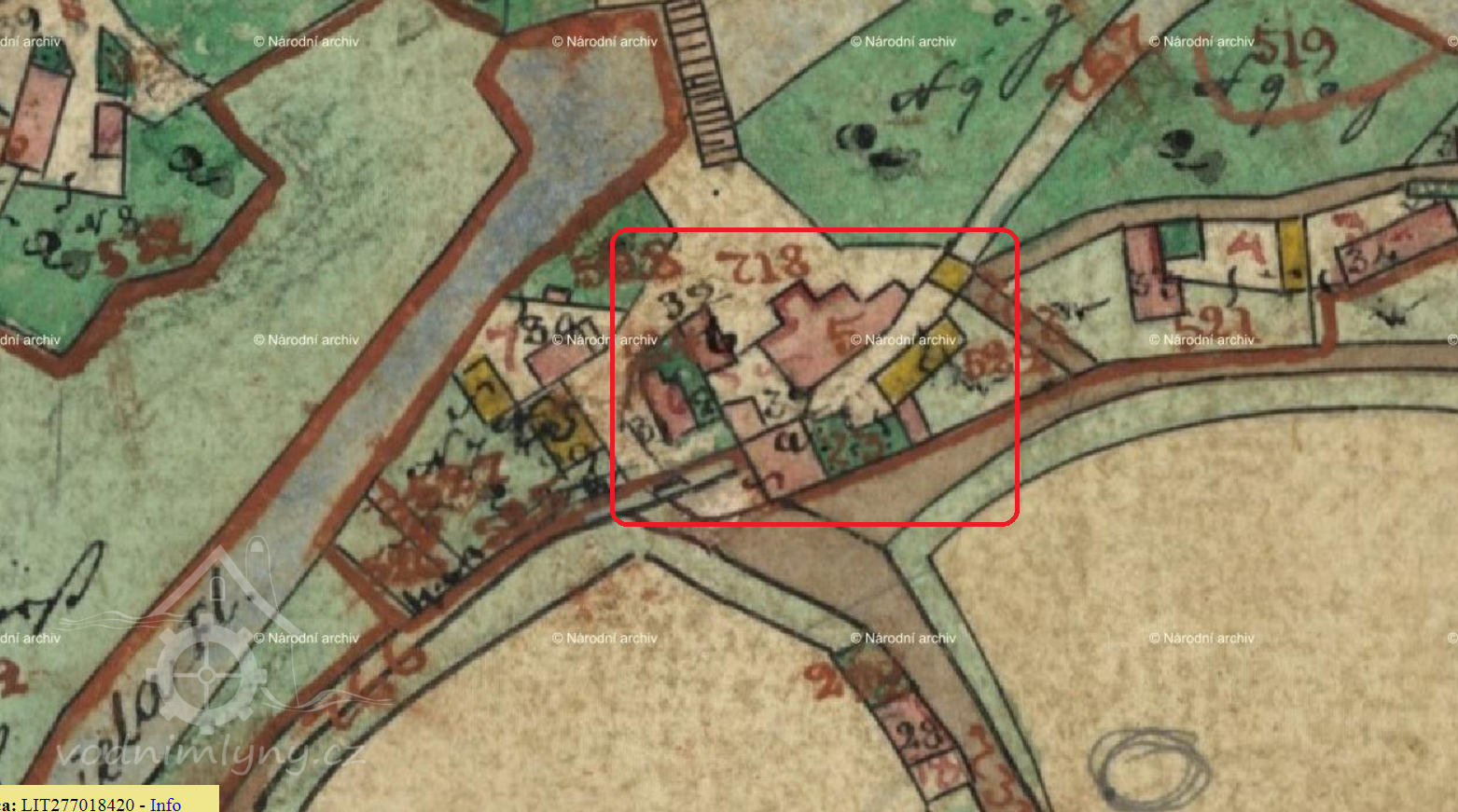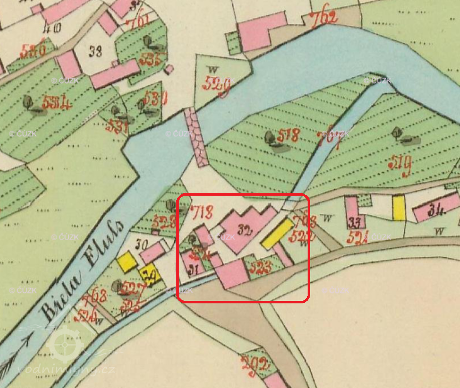 Popis1930: 1 kolo na svrchní vodu, hltnost 0,305 m3/s, spád 3,4 m, výkon 9 HP