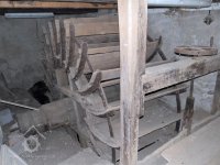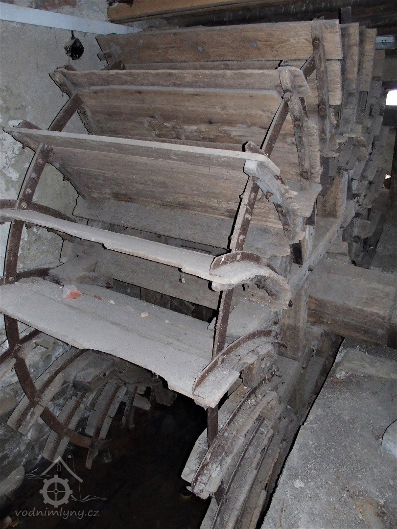 Vodní kolo lopatkového typu je uloženo v kolové komoře v přízemí objektu. Voda byla ke kolu přiváděna, kameny zpevněným, náhonem, který ústí do východní části budovy. Do dnešní doby se zachovalo i stavidlo se zdvihacím mechanismem, umístěné v dřevěném rámu před vodním kolem, které vodu zadržovalo a regulovalo množství vody přitékající na lopatky. Kolo složené z bočních dřevěných věnců, je upevněno na dřevěném hřídeli, neseno rameny zhotovenými taktéž ze dřeva. Lopatky jsou dřevěné, složené z několika dílů, takže plynulé zakřivení lopatek vzniká několikanásobným lomením. Hřídel přechází stěnou kolové komory do vedlejší strojovny, kde se nachází soustava litinových kol s dřevěnými palci.