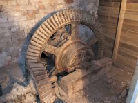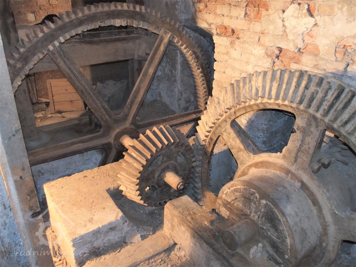 PopisPředmětné soustrojí pohonu tvoří vodní lopatkové kolo o průměru 394 centimetry typu Poncelet na spodní vodu se zvýšeným nátokem, vyrobené z habrového a dubového dřeva, doplněné kovovými konstrukcemi, s bočním litinovým věncem s habrovými palci. Druhou funkční částí, celkově umístěnou ve strojovně, je velký litinový věnec také s habrovými palci s pastorkem, mající průměr 236 centimetrů, osazený na předlohové hřídeli v ložiskových domcích. Třetí část tvoří rozvodová transmisní hřídel s pastorkem v kluzných ložiscích, na které jsou osazeny dřevěná a litinová řemenice, ukryté pod podlahou strojovny, které přenášely pohyb pomocí řemenů a poháněly dynamo a prostřednictvím hlavní rozvodové transmise i zařízení strojovny – tyto další části se však v interiéru nezachovaly.
