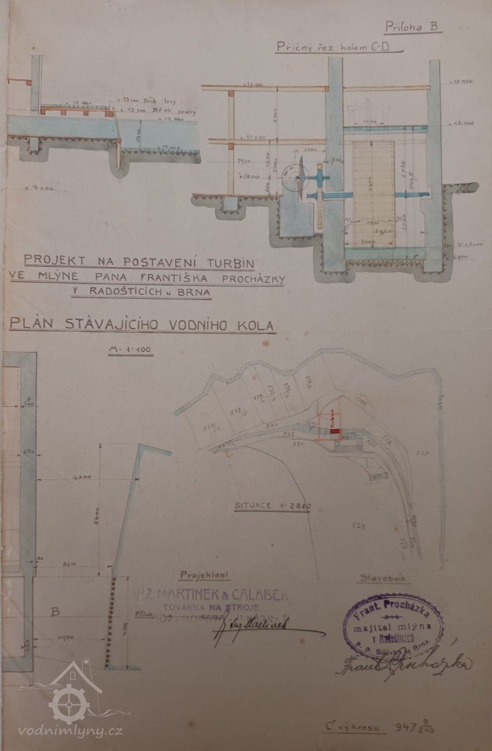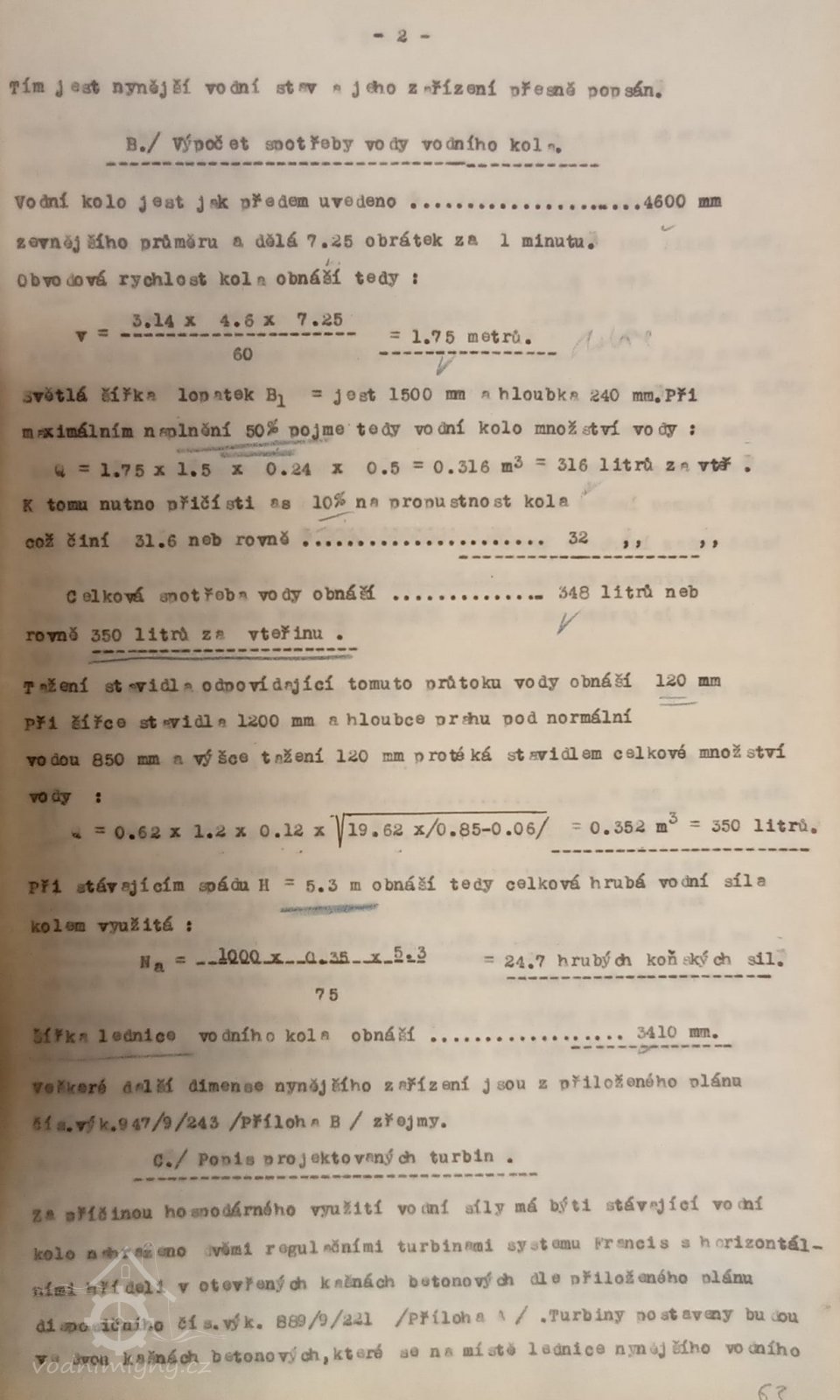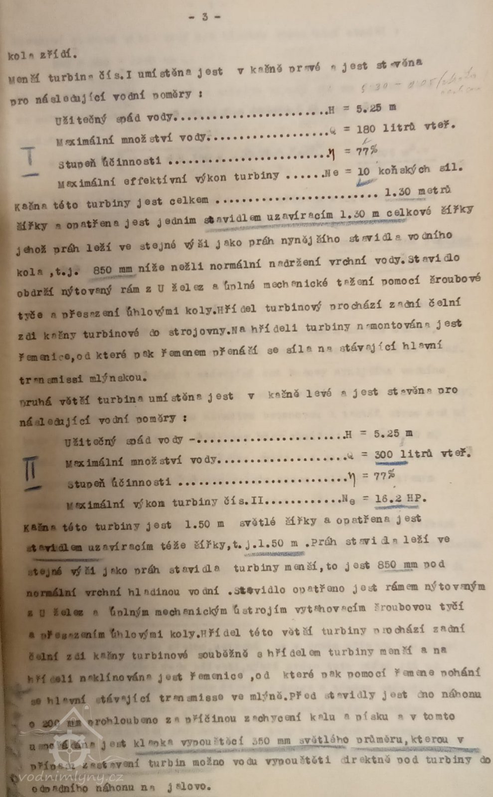 2. hltnost 0,3 m3/s, spád 5,25 m, výkon 16 HP
