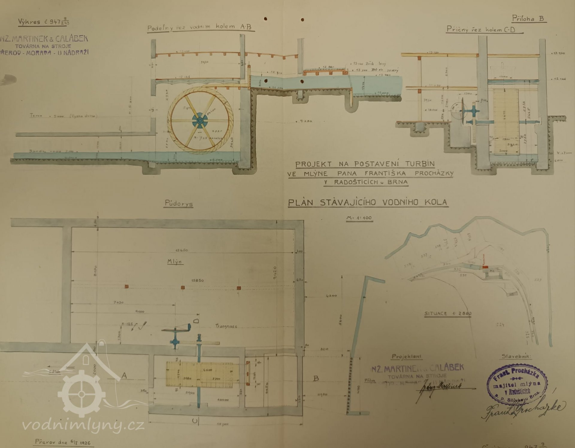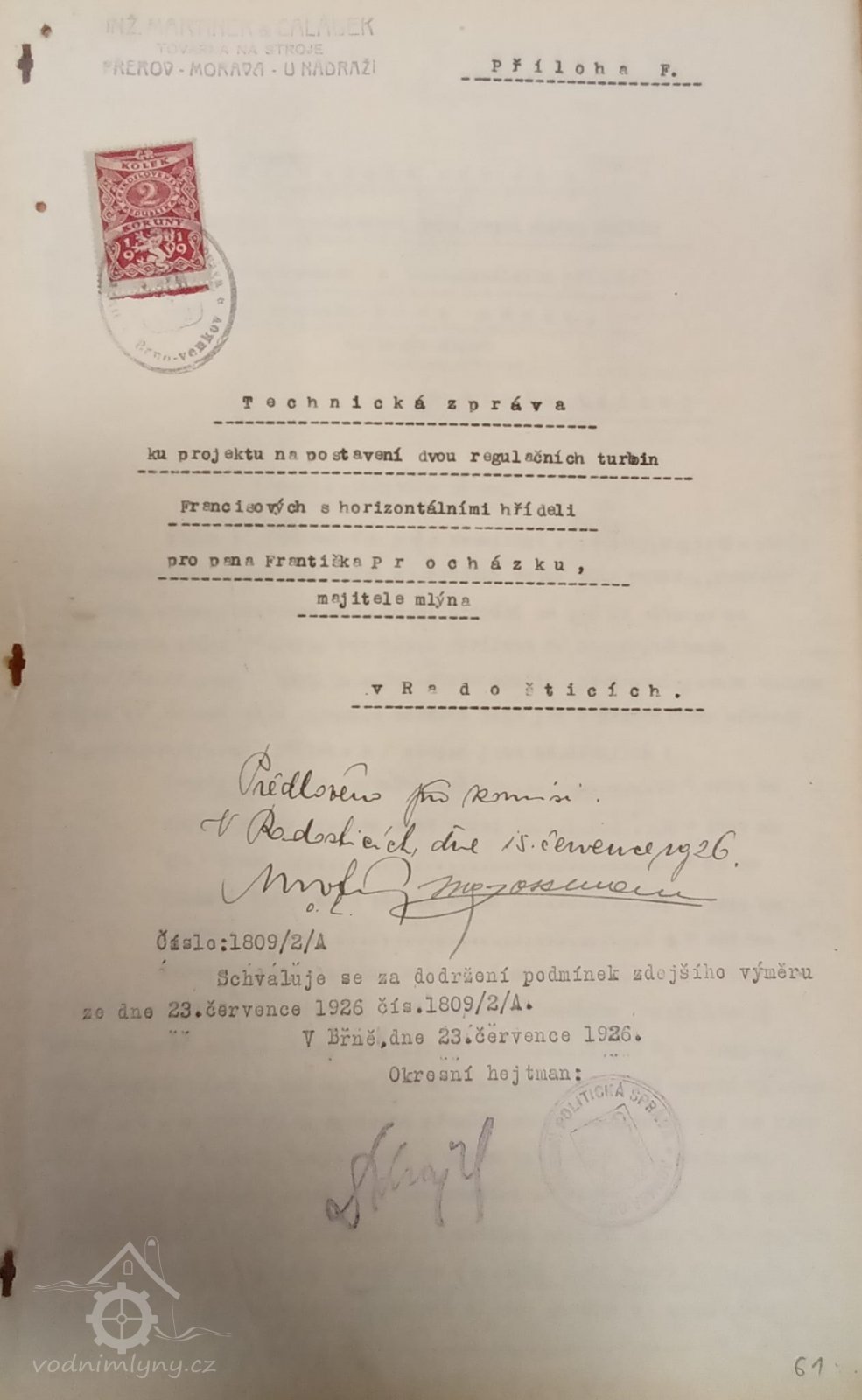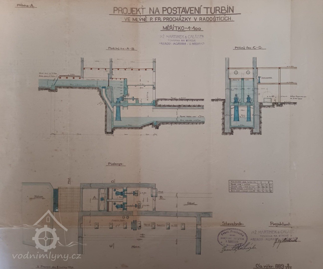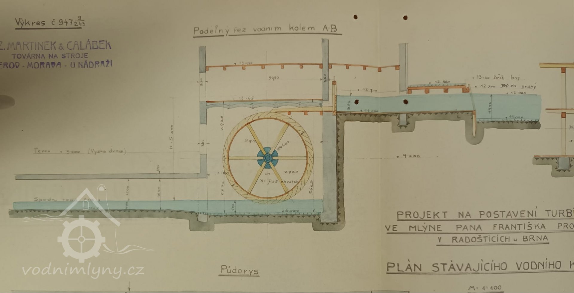 1. hltnost 0,18 m3/s, spád 5,25 m, výkon 10 HP,