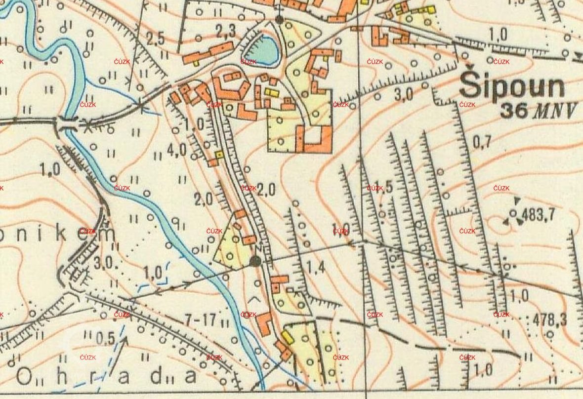Šipounský mlýn Františka Hanuše (1930) s provozem pily. Ve mlýně dochováno kompletní umělecké složení z poslední rekonstrukce v roce 1949