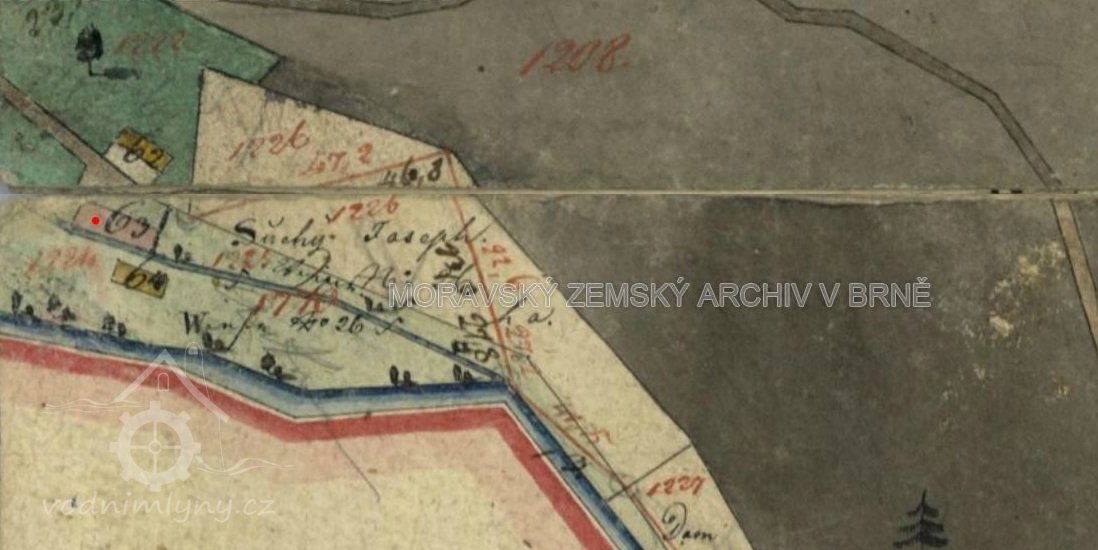 1642 urbář: k mlýnu náleží 3 jitra pozemků, platí 55 kr. činže, odvádí 2 slepic a 12 vajec