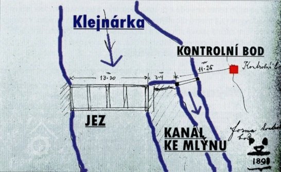 Voda z potoka Klejnárky se vzlíná stálým jezem ze dřeva a kamene zhotoveným. Na jez tento resp. na jeho korunu vkládají se nástavky 25 cm vysoké. Od jezu vede se voda stavidlem 1,55 m širokým do náhonu, jehož šířka obnáší 0,20 m a jenž ústí do malé nádržky, která se před mlýnem nachází. Do této nádržky ústí direktně potůček od Zbožňova a Opatovic, z něhož voda nadržena jest hrázkou z kamene a hlíny.