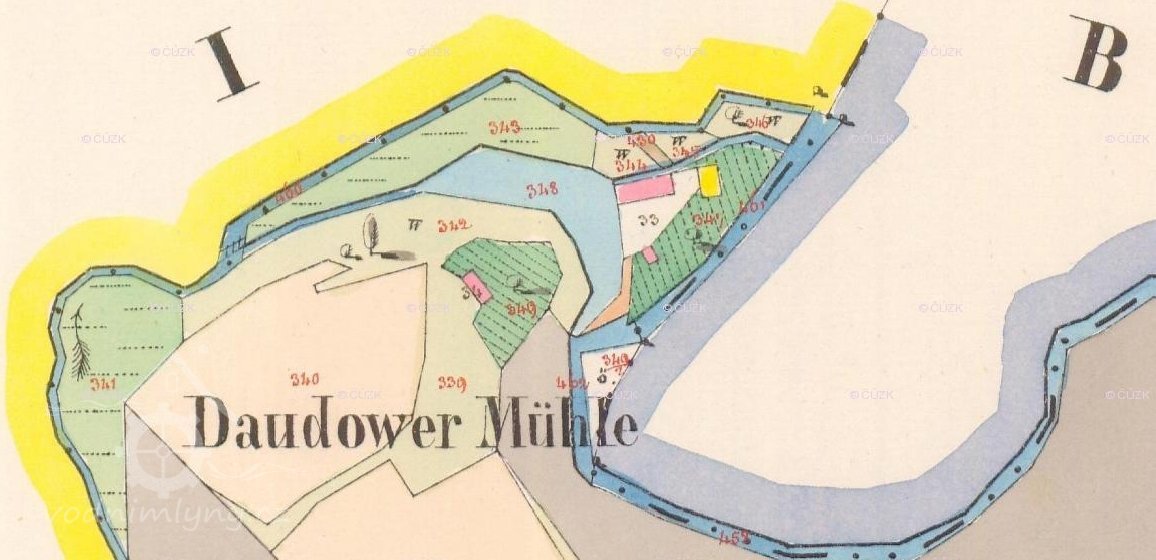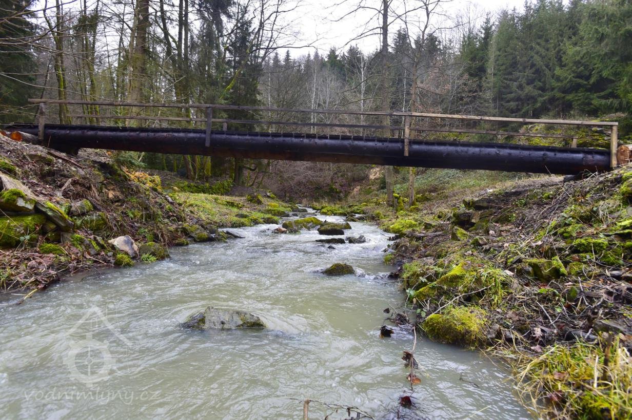 Z nádržky vede se voda stavítky 40 cm ve světlosti na 2 mlýnská kola, která jsou na vrchní vodu zařízená.