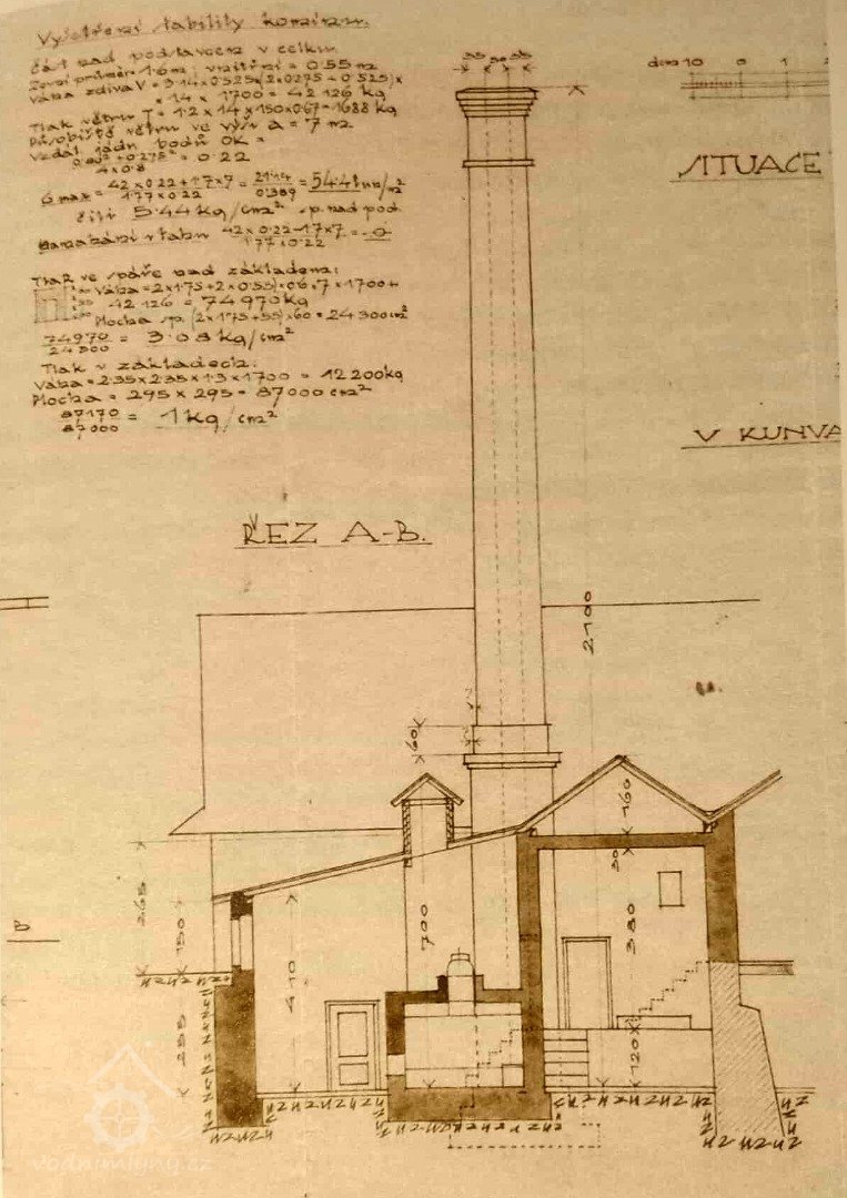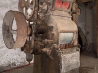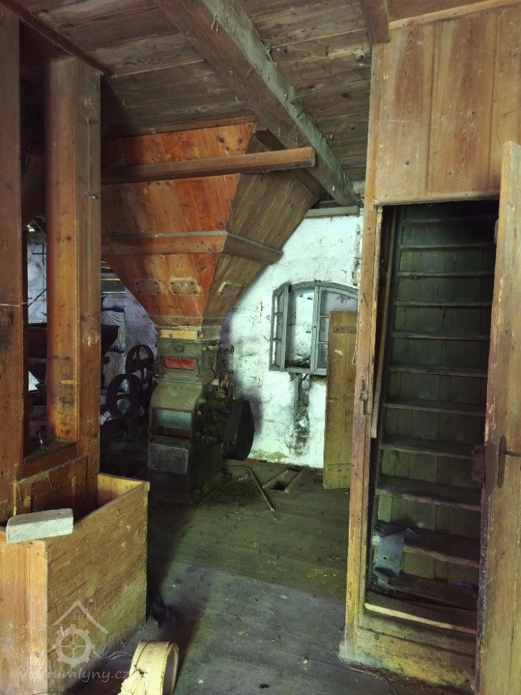 Válcová stolice a kamenné složení, 09 2025, © Jiří Landis, (Prvky na obrázku: kamenné složení (šrotovací, mlecí), válcová stolice, zásobník, násypka)