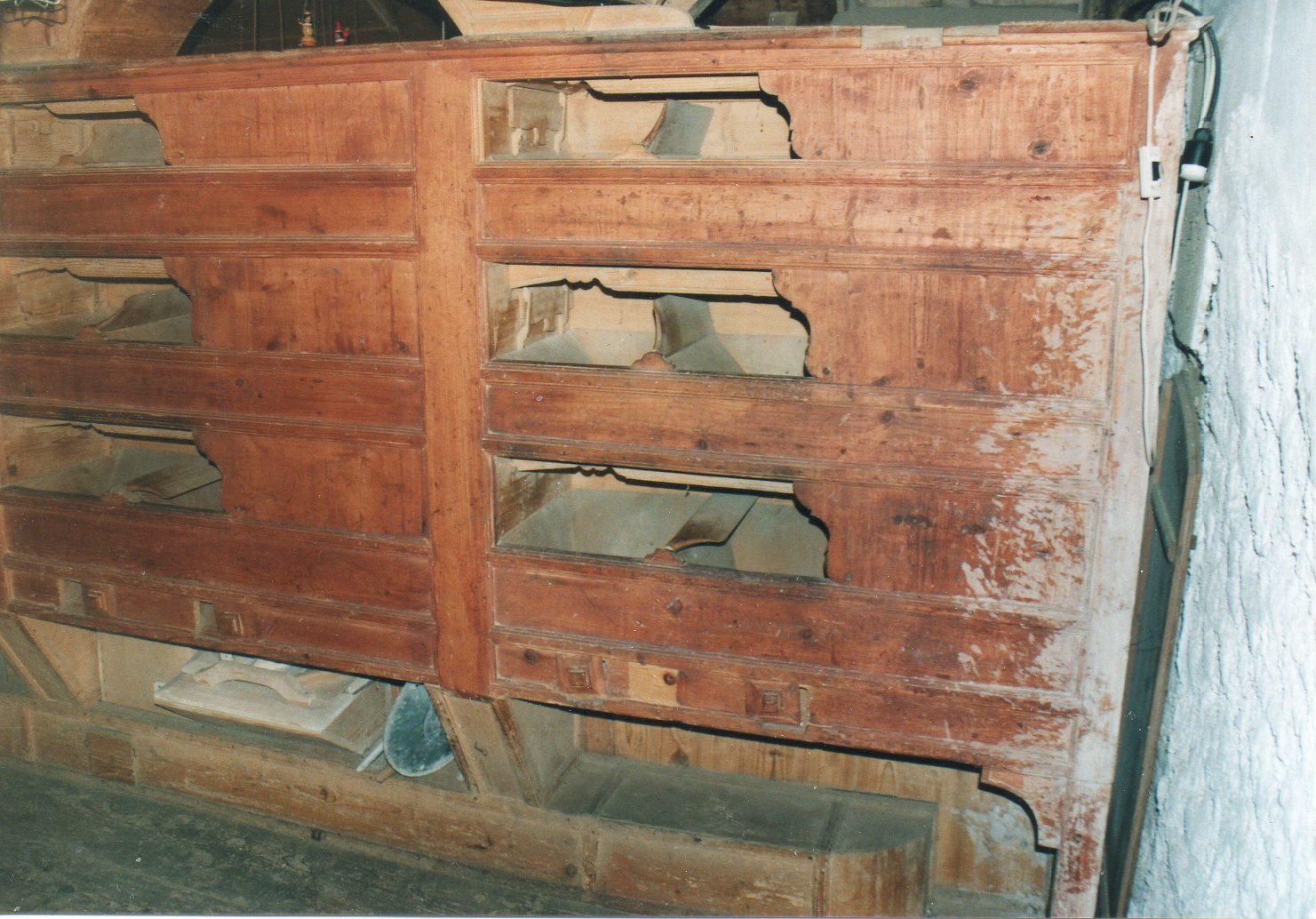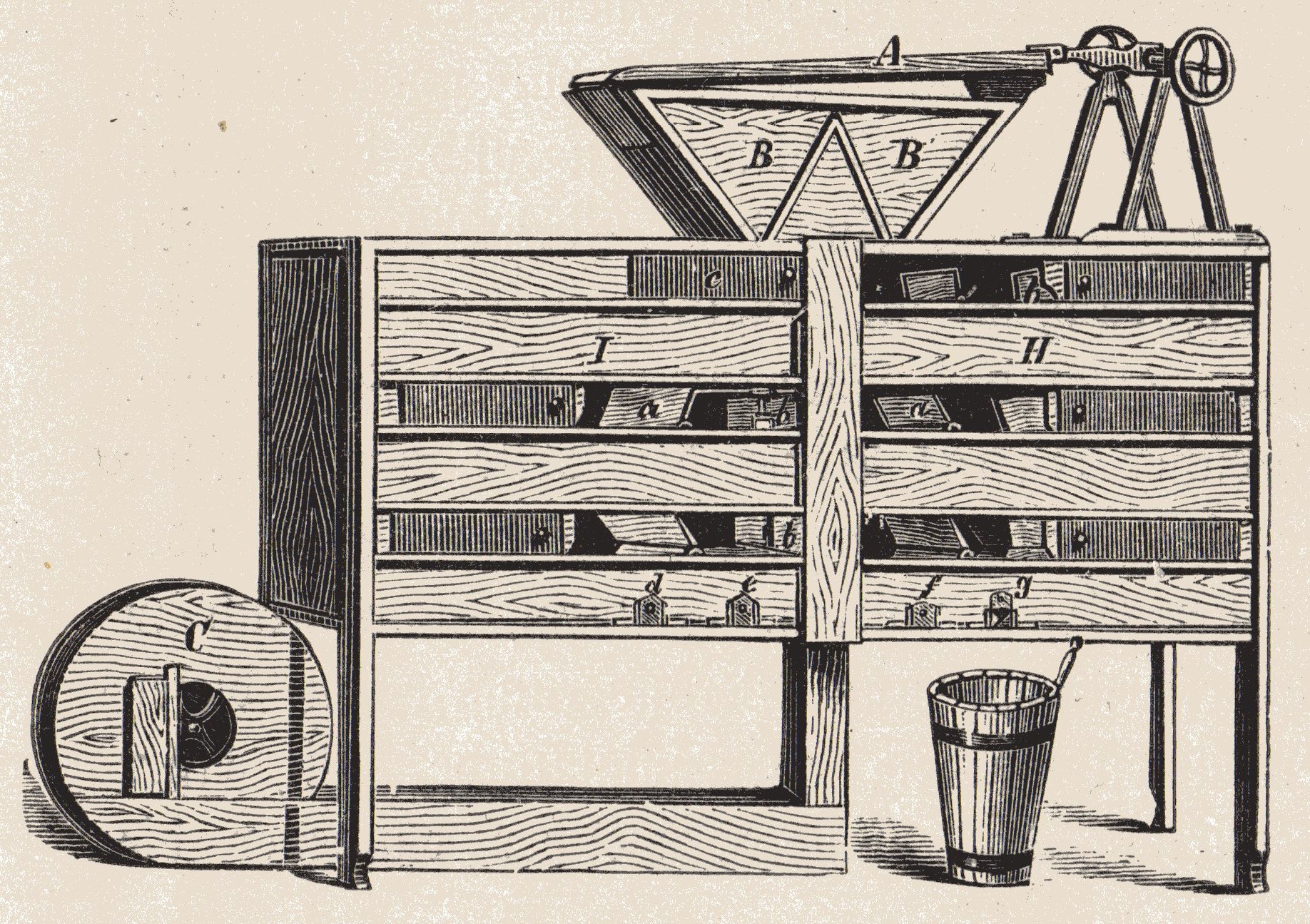 ♦ Stroj samotný je dřevěná konstrukce obdélníkového tvaru, uvnitř které se nachází dvě až čtyři patra malých přihrádek nad sebou.