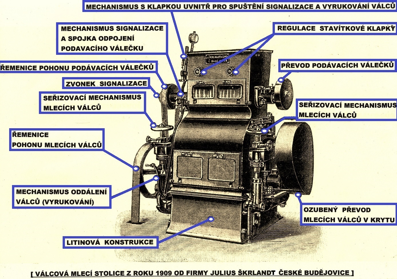 Mlecí stolice s rýhovanými válci z r. 1892 od fa Bohumil Říha Plzeň, obrázek z katalogu firmy.