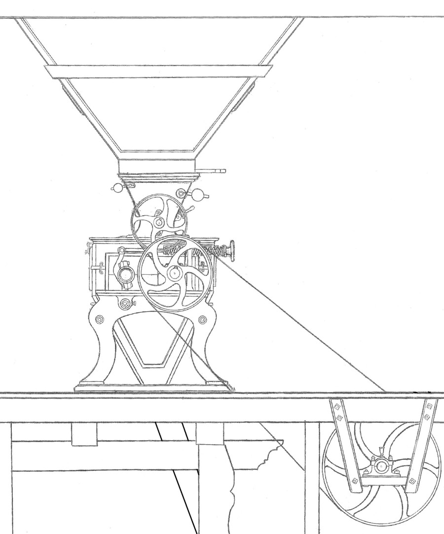 Ukázka usazení stroje ve mlýně, kresba: D. Veverka 2012.