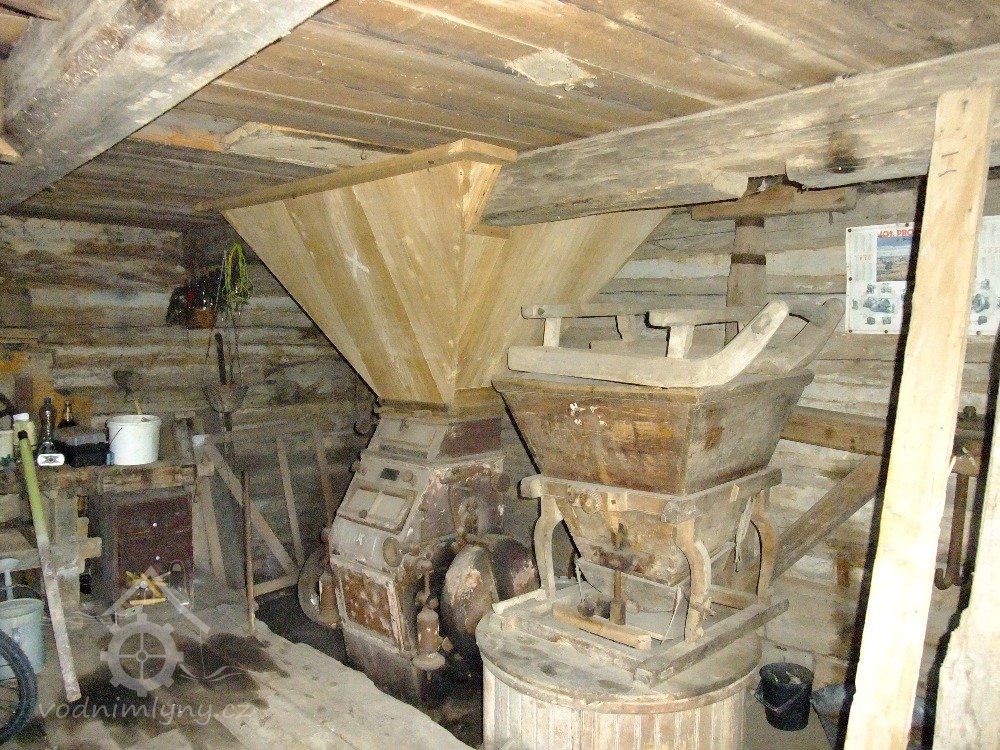 loupačka průchodová firmy Sedláček - Kostelecké Horky z 20. let 20. stol., pod ní žejbro s excentrem na čištění zrna, 2012, © David Veverka, (Prvky na obrázku: žejbro, loupačka)