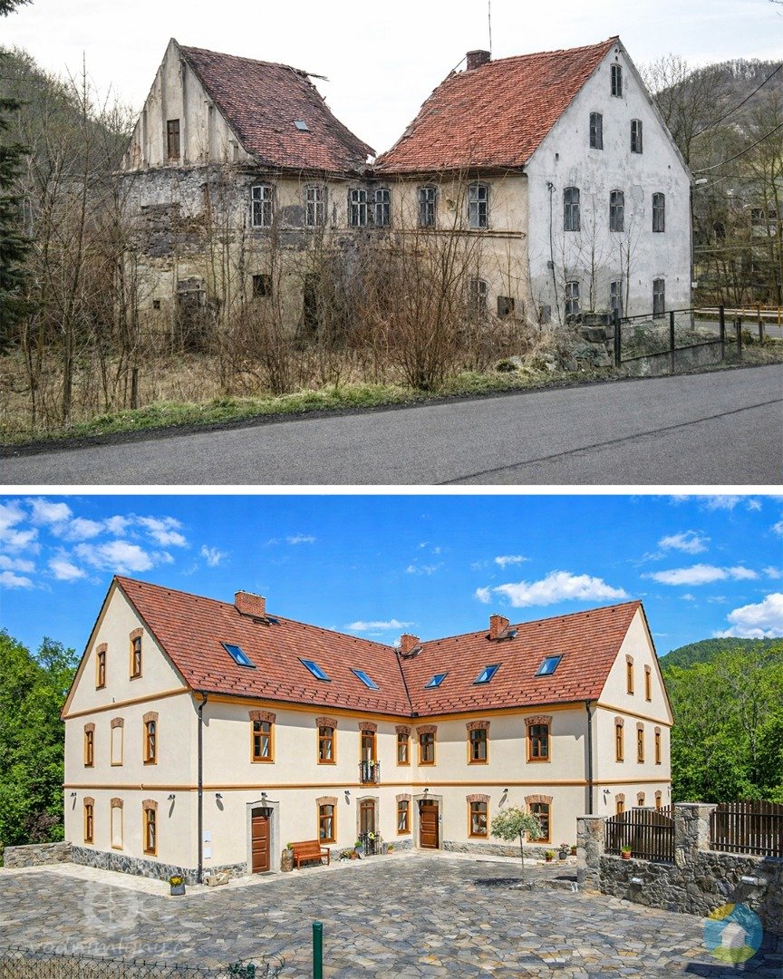 Mlýn před rekonstrukcí a dnes, 2016-2026, © Poznej domy
