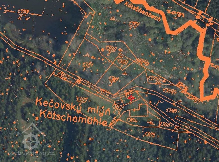Ortofoto a mapa pozemkového katastru, výřez, 2009-2015, © viz cirkevni-restituce.cuzk.cz
