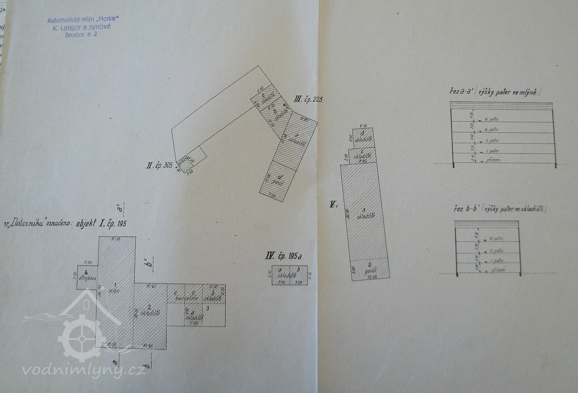 Polohopisný plán mlýnských budov firmy Automatický mlýn Horka, K. Langer a synové, Brodce n. L., cca 1938, © Mlynářské ústředí