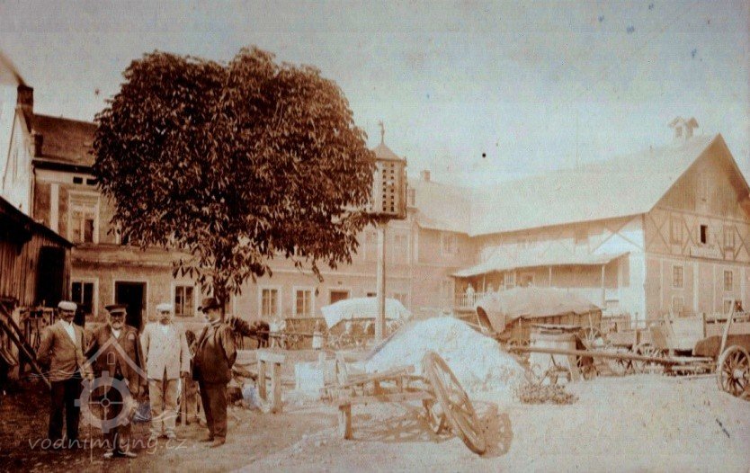 Karel Kopš (patrně s částí personálu) na dvoře mlýna, 1904, © archiv rodiny Břeských (foto: O. Wellat)