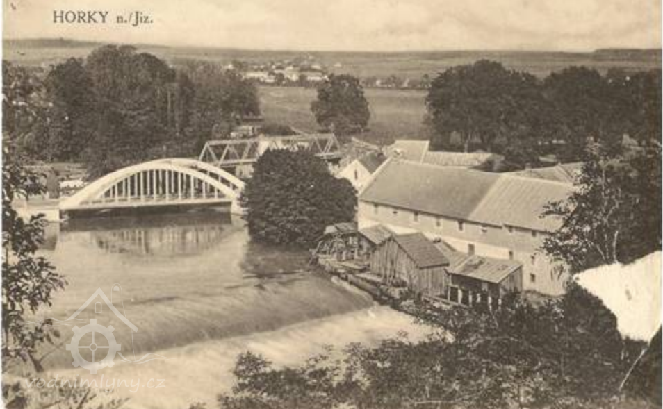 Pohlednice Horek z r. 1904 (mlýn zcela vpravo u jezu), 1904, © http://www.horkynj.cz/texty/prezentace3.pdf, sn. 19