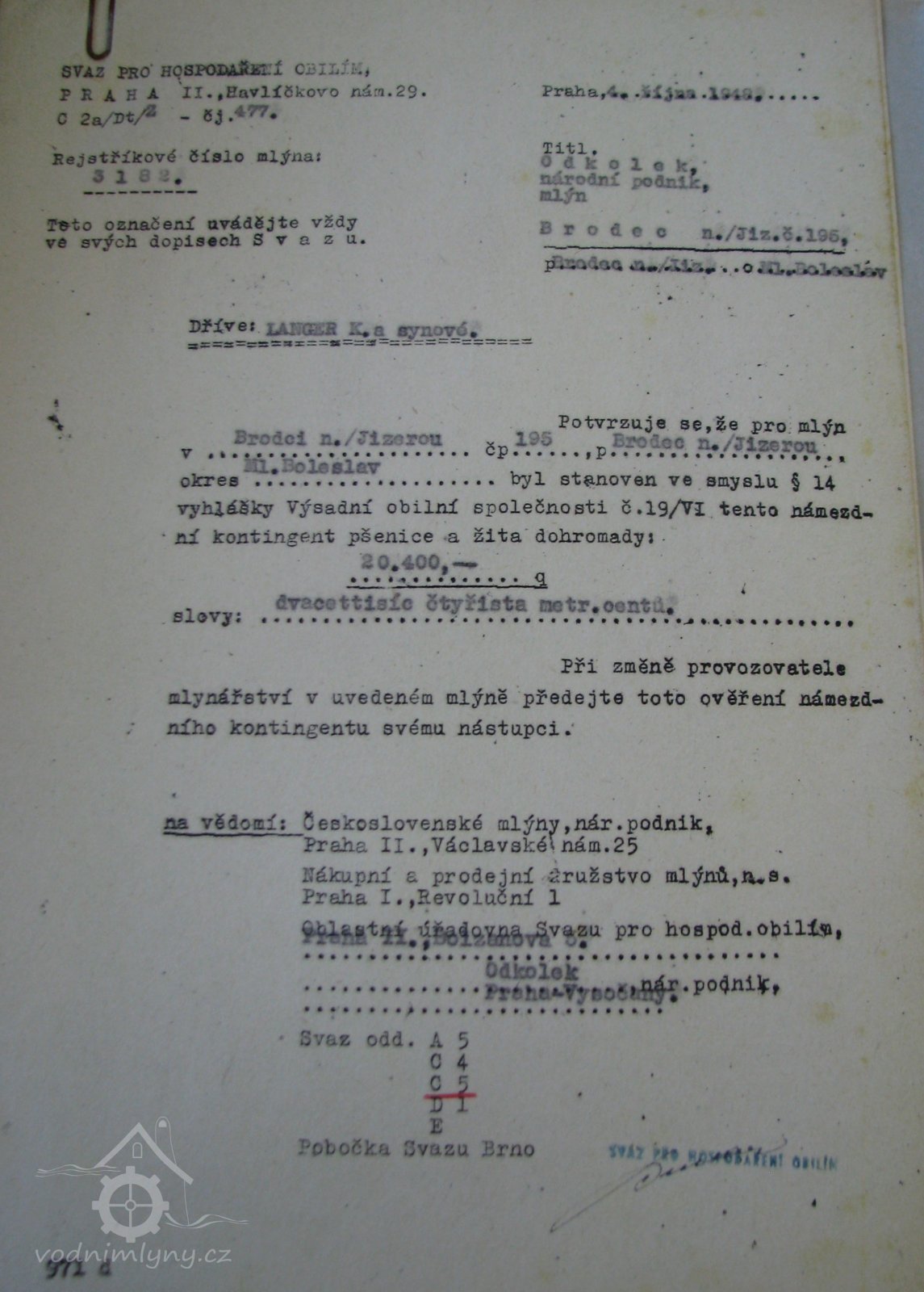 Vyměřený kontingent pro Odkolek, n.p., dříve Langer a synové, 4. 10. 1948, © Mlynářské ústředí