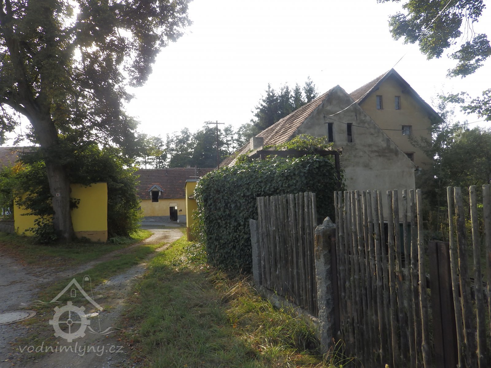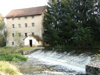 Na budově bývalého mlýna byly provedeny zatím jen udržovací stavební práce. Vpravo jsou vidět zbytky náhonu. Pohled od jihozápadu, 2014, © mapy.cz