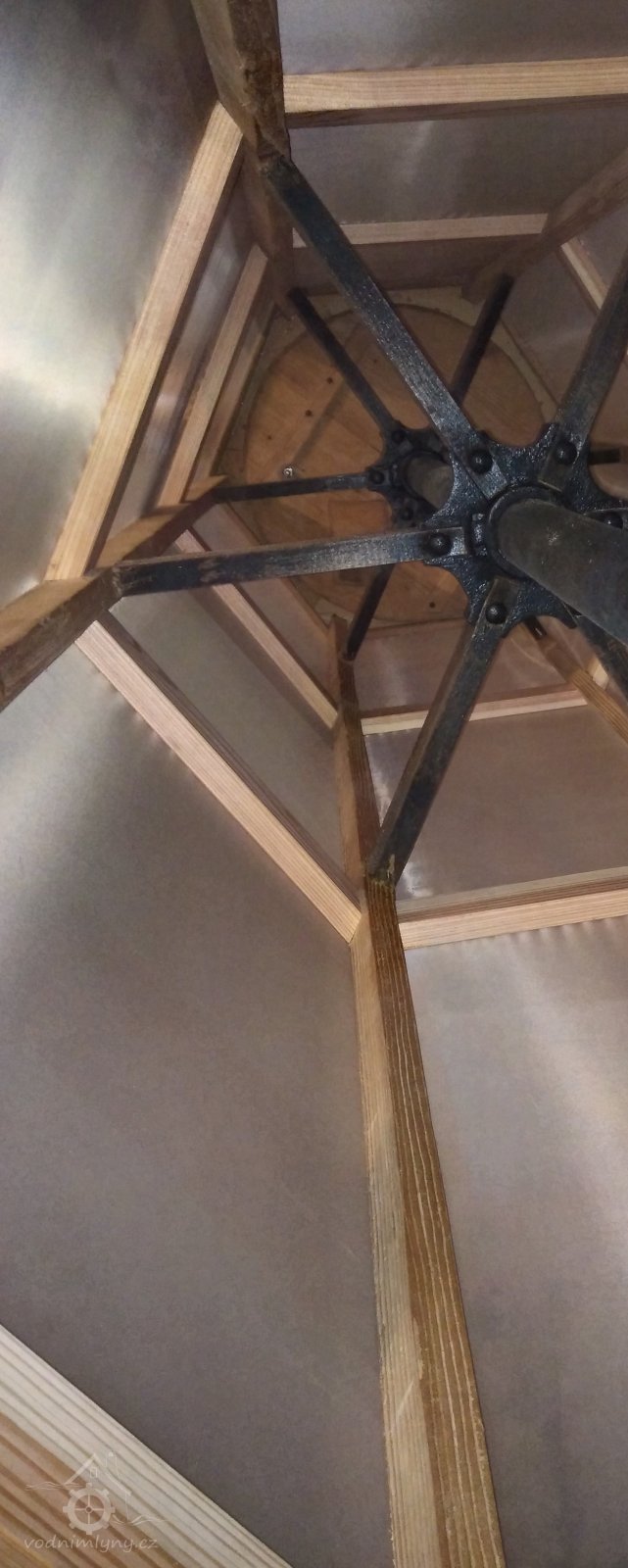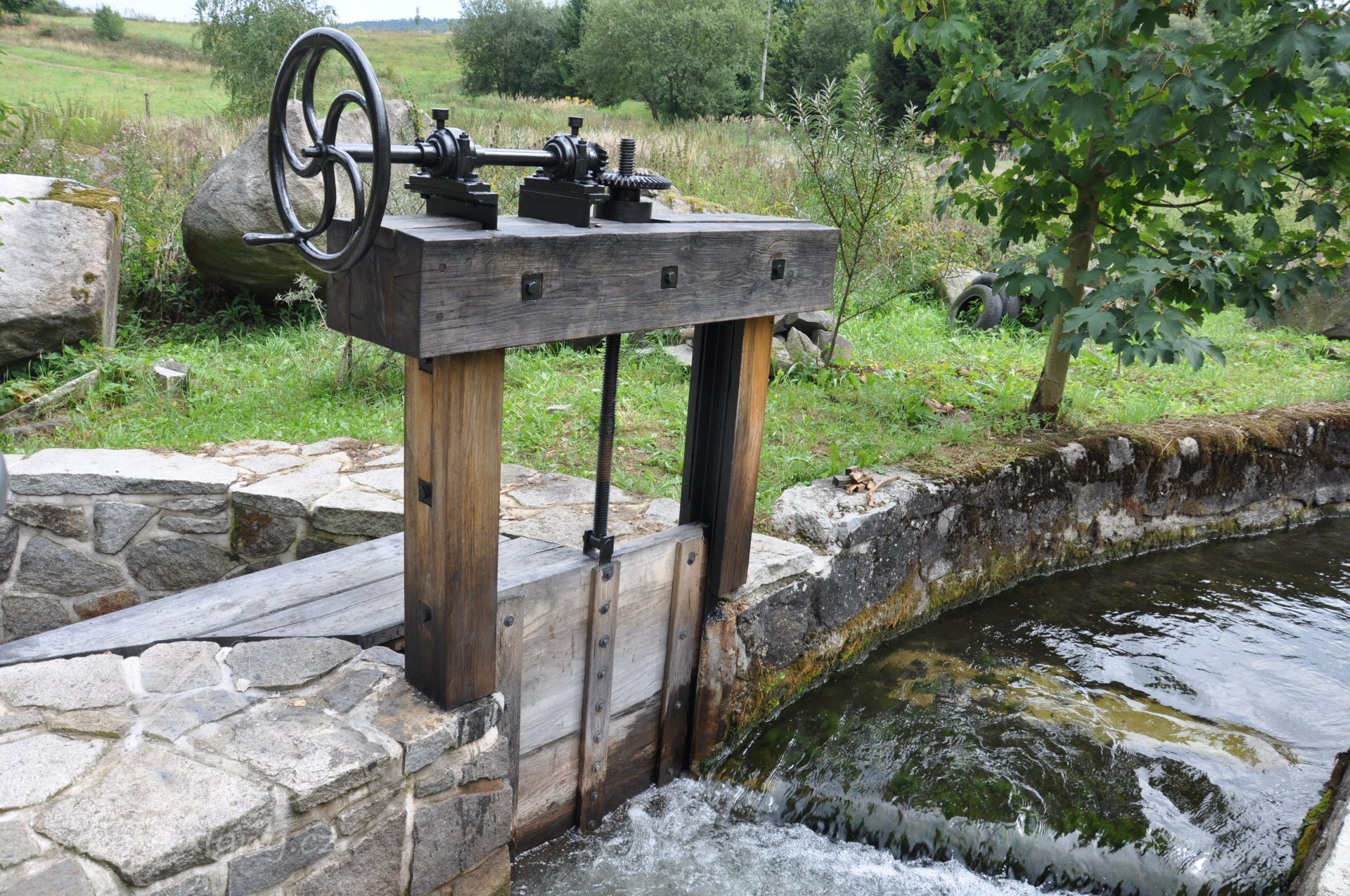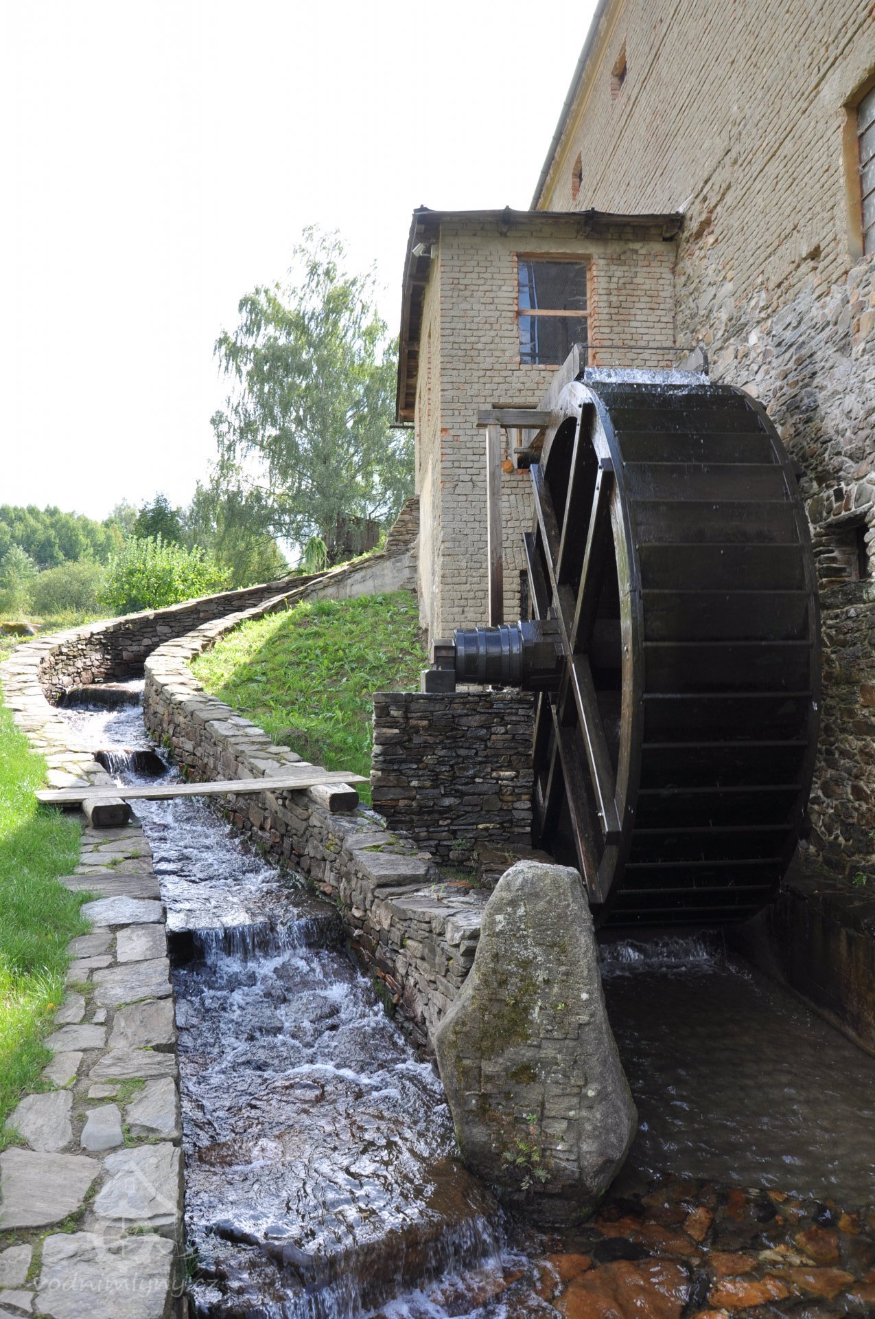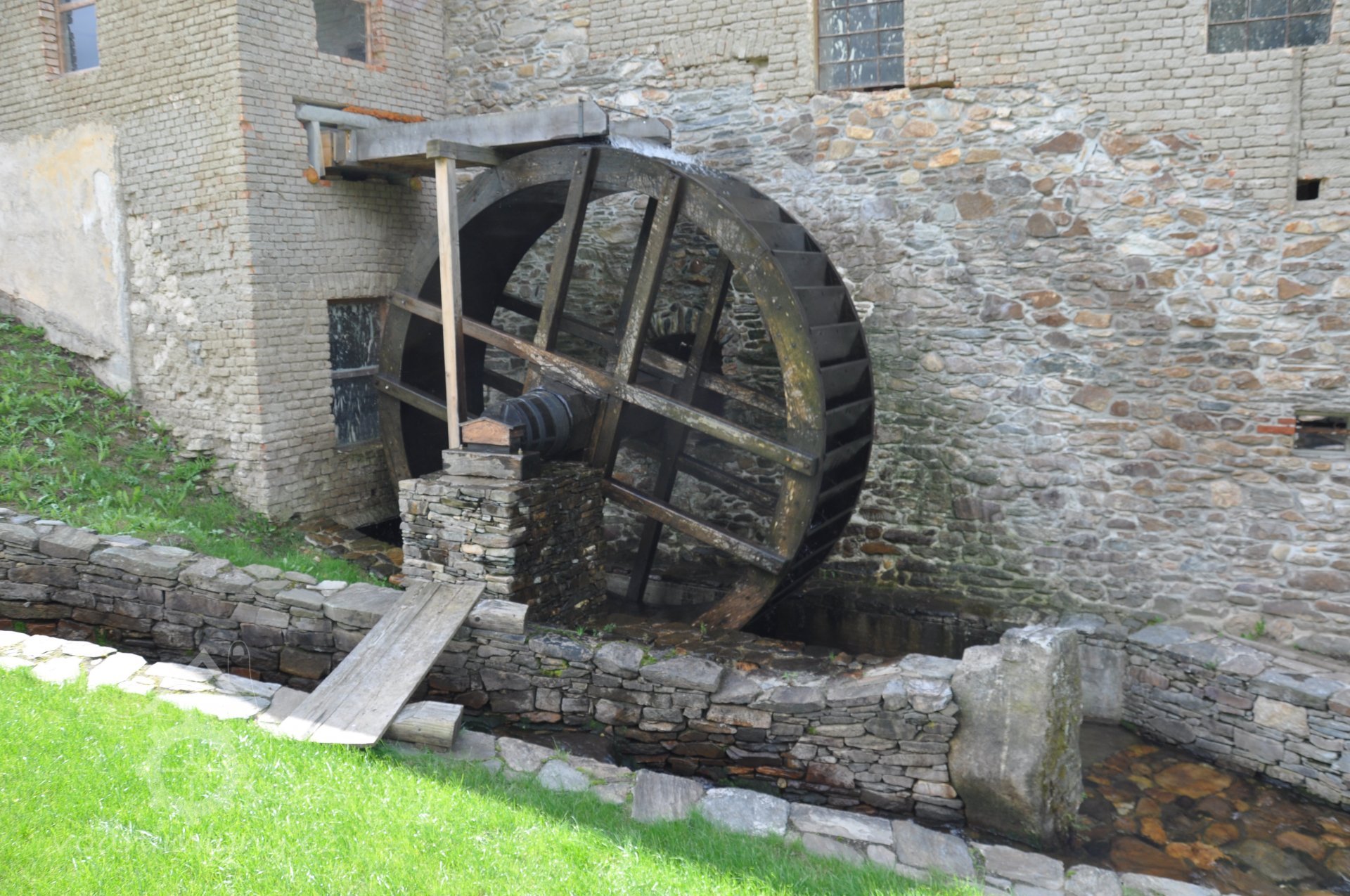 PopisObnovené vodní kolo na vrchní vodu.