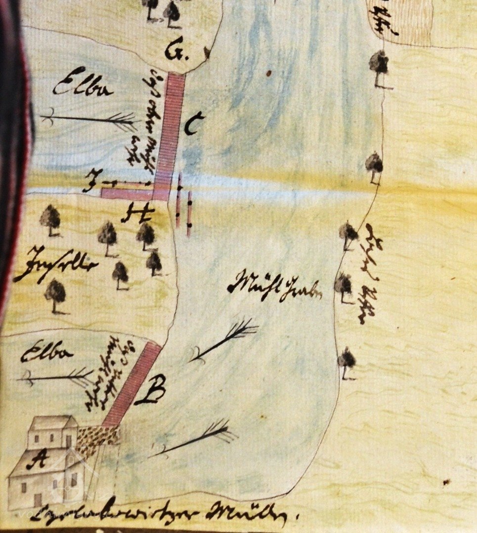 moučných 8, pila o jednom rámě jedna, slupě jedna. Platívalo se nájmu pšenice 10 strychů, žita 180 strychů, ječmene 35 strychů, prachu půdního 30 strychů“.