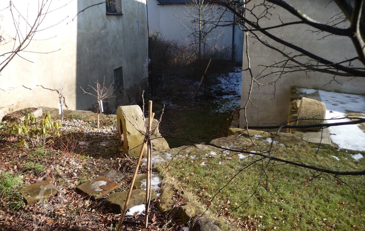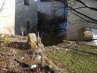 Na dvoře mlýna jsou uloženy 2 ks rozbitých mlecích kamenů (HŠ).