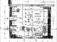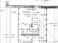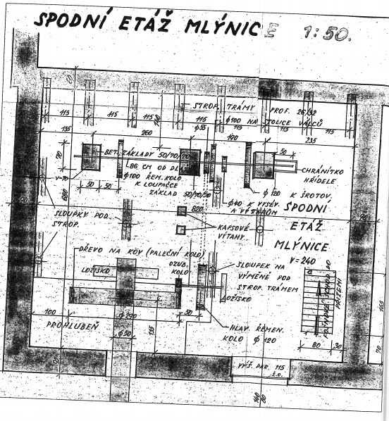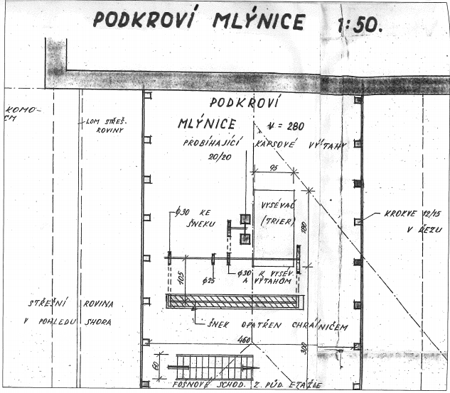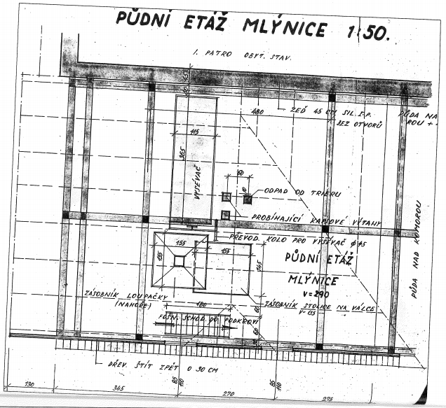 přízemí - loupačka, válcová stolice, šrotovník, příjem obilí a výdej mouky