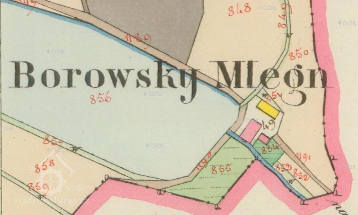 Dne 10. září 1810 se novým majitelem Borovského mlýna stal mlynář Mathias Piech. Jak mlýn v této době vypadal nevíme, ale písemnosti z roku 1821 uvádí, že již byl označen číslem popisným 28  a přináležely k němu polnosti pojmenované "pole za rybníkem horní", "pole za rybníkem prostřední", "pole za rybníkem dolní", " u Žlabu" a "u palouku", o celkové výměře 10 jiter, 1273 a 5/6 sáhu, tj. 6,21 ha. K mlýnu patřily též louky nesoucí pomístní názvy "utopená pod rybníkem", "pod hrází" a "u palouku", o rozloze 1286 a 1/6 sáhu, tj. 0,46 ha. Z mlýna platil mlynář Piech vrchnosti roční nájem ve dříve stanovené výši 27 zlatých rýnských.