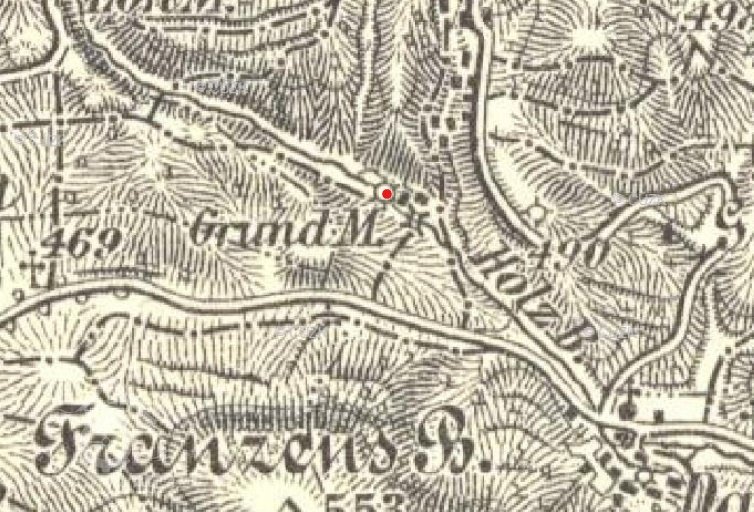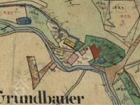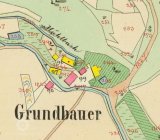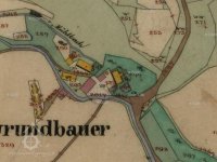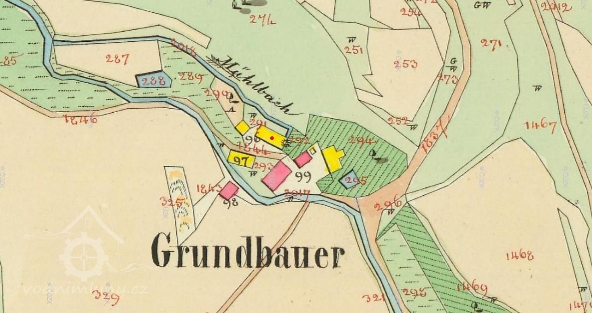 Zbořený mlýn, na jeho místě se nyní nachází les. Náhon je dosud částečně naplněn vodou. Vedle stála ještě usedlost čp. 80 a celá samota se jmenovala Grundbauer.