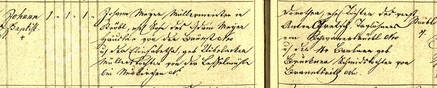 V roce 1843 je v matričním zápise o narození syna Johanna v čp. 4 zmiňován mlynářský mistr Johann Mayer s manželkou Dorotheou, rozenou Gretsch. Jednalo se pravděpodobně o první zdejšího mlynáře, do té doby byla u obyvatel čp. 4 uváděna živnost polír.