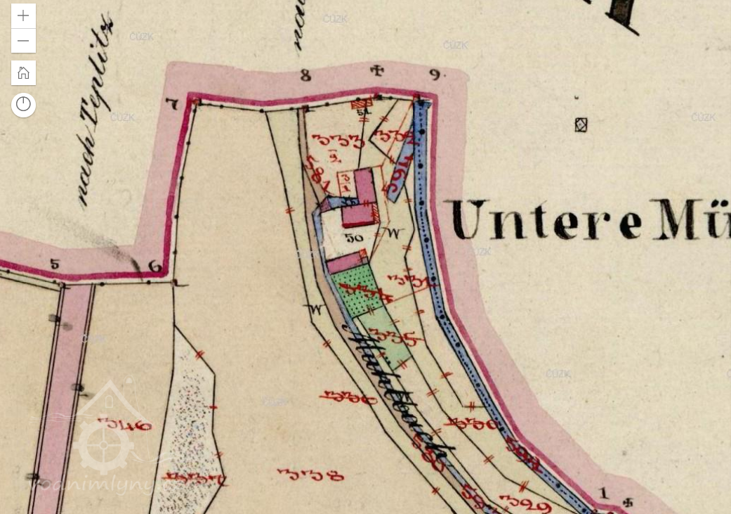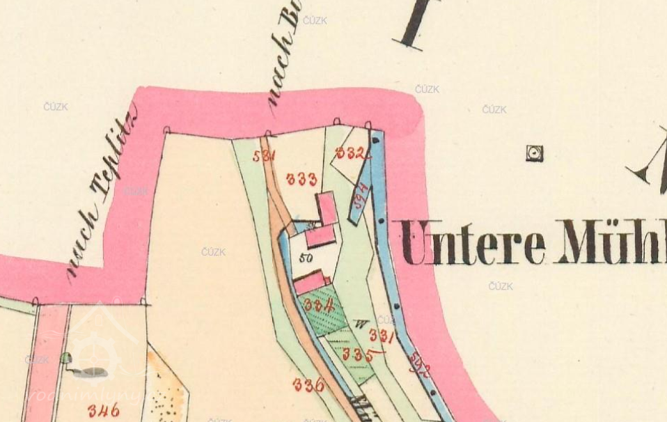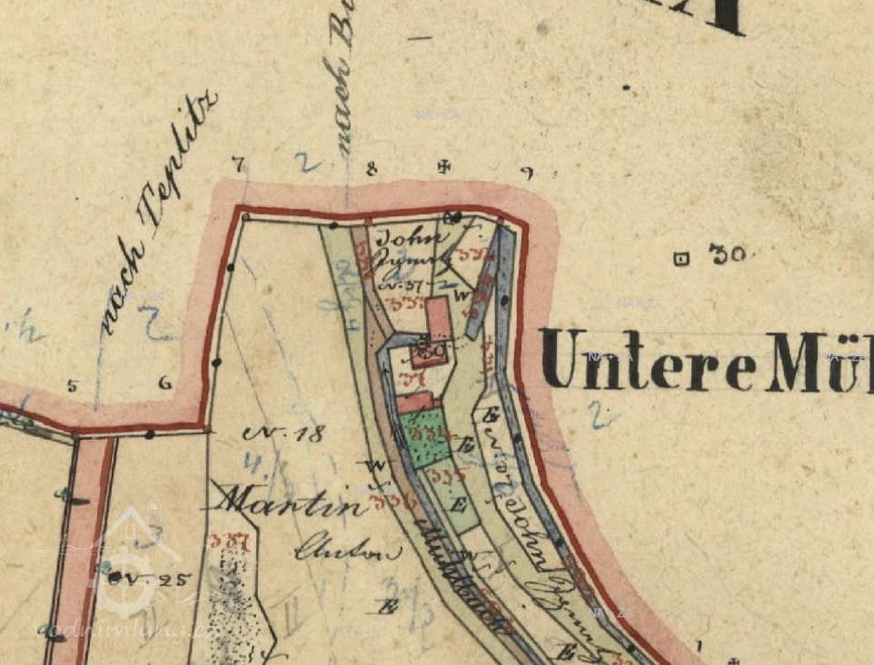 1842 - společně s Horním mlýnem měl čp. 37, Ignatz John byl majitelem pouze Dolního mlýna.