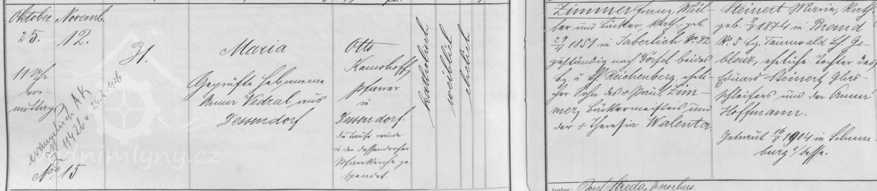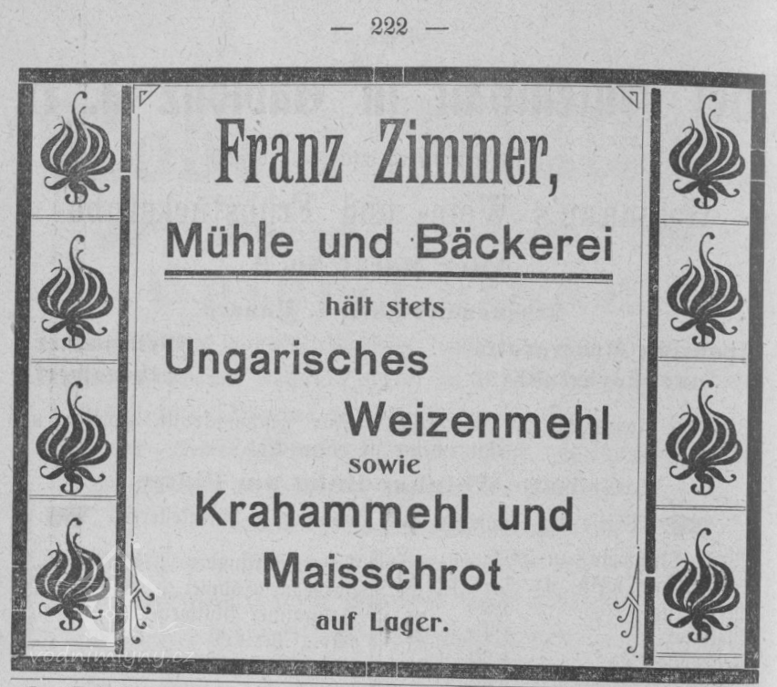 Na přelomu 19. a 20. století byl majitelem mlýna Franz Zimmer, syn pekařského mistra z obce Vesec na Liberecku (dnes součást Liberce). V srpnu 1904 se v Šumburku oženil s Marií Steinert, dcerou brusiče skla z obce Žďár. V říjnu 1905 se jim narodilo první dítě, dcera Maria. Za Franze Zimmera byla u mlýna pekárna. Byl posledním mlynářem na tomto mlýně.