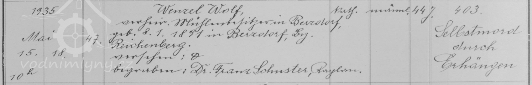 Mlynář Wenzel Wolf se dne 16. 2. 1920 se oženil s Elfriedou Schwind, dcerou obchodníka ze Starého Harcova. V říjnu 1921 se jim narodil syn Gert, který však zemřel již v srpnu 1922 na choleru. Wenzel Wolf provozoval mlýn až do smrti v květnu 1935, kdy ve věku 44 roků spáchal sebevraždu oběšením.