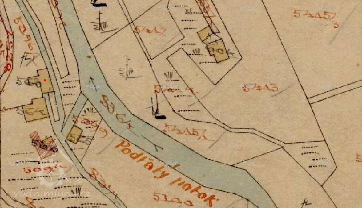 Popis1930: 1 kolo na spodní vodu, hltnost 0,25 m3/s, spád 3,4 m, výkon 1,8 HP