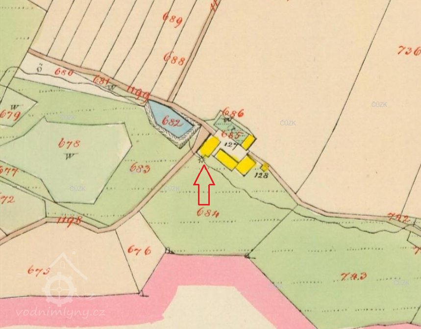 Na mapách stabilního katastru je mlýn zakreslen jako budova ze spalného matriálu s vodním kolem na jižní straně stojící nedaleko hráze menšího rybníka. V té době zde hospodařil mlynář Andreas Pawlick s manželkou Katharinou Plöscher.