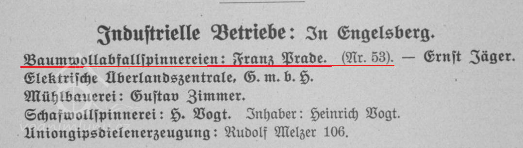 V roce 1914 byl majitelem přádelny Franz Prade.