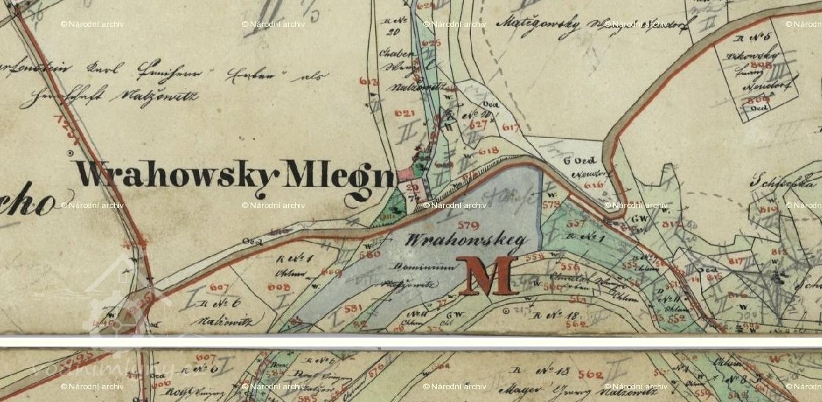 před rokem 1870 právo vodní, záležející v tom, že zavlažuje a povodňuje panské louky podél potoka Musíka č. katastrální 1271 ležící a zejména louku č. katastrální 85 obce Nalžovické, vodou z potoka Musíka do strouhy loukou velkostatku č. katastrální 85.“
