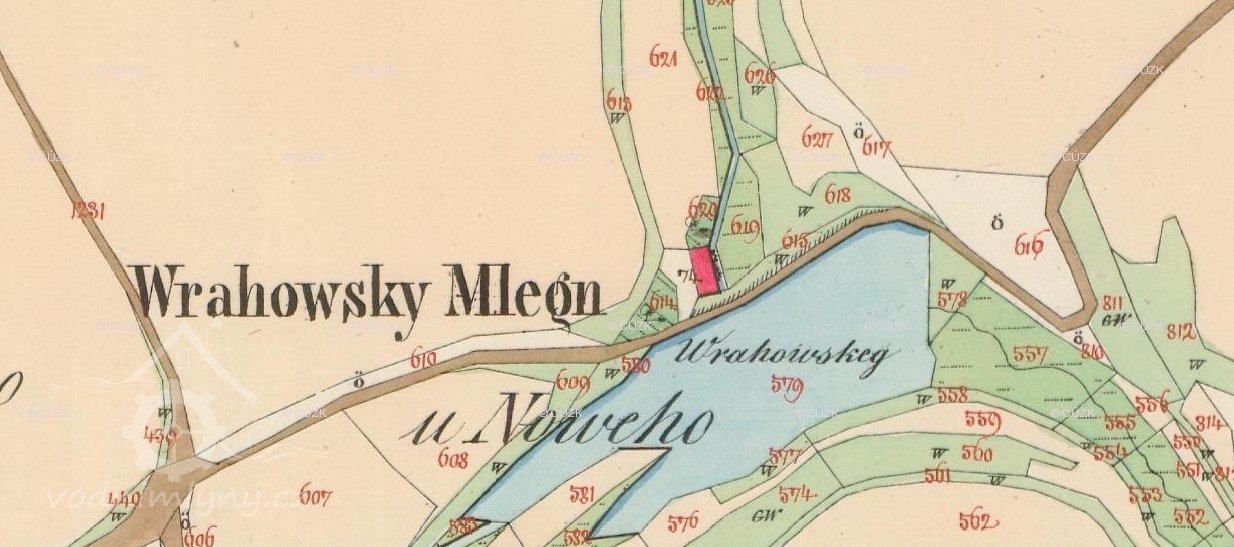 Mlynářem zde byl 19. března 1875 Augustin Slaba. Dne 19. března 1875 oznámil Augustin Slaba z nařízení okresního hejtmanství v  Sedlčanech dne 9. listopadu 1874, že má v držení mlýn Na Vrahu: (...) Jsem majitelem tak zvaného mlýna Vraha čp. 20 patřícího k dědině Chlumské místní obce Nalžovické, a že mě co takovému majiteli přísluší následující vodní právo: Používám a držím k pohybování mých mlýnských strojů všechnu vodu, která otvorem mlýnské strouhy z panského mlýnského rybníka č. parcelní 579 na tyto mlýnské stroje, pomocí vantrok a žlábků přitéká a již v rozloze své rybník tento obsahuje pokud tomu otvor mlýnské strouhy a výška stavidel splavu rybničního úplně poskytují. Do tohoto pansko mlýnského rybníka vedou přítoky z rybníků číslo parcelní 544 a 545 a pak z takzvaného hlavního rybníka „Musíka“ patřícího k velkostatku Vysokému Chlumci a toto právo moje vztahuje se na celé množství vody řečených přítoků. Na tuto vodu uvedenou v řečeném směru, rozloze a množství nemá mimo mě nikdo jiný právo.(...).“