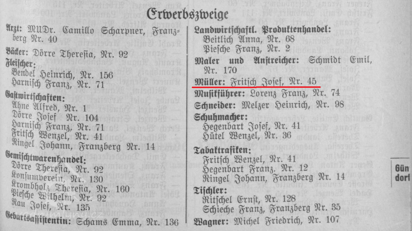 V roce 1927 uvádí adresář obce v čp. 45 mlynáře Josefa Fritsche, stejný údaj je ve výpisu živností Huntířova z roku 1934.