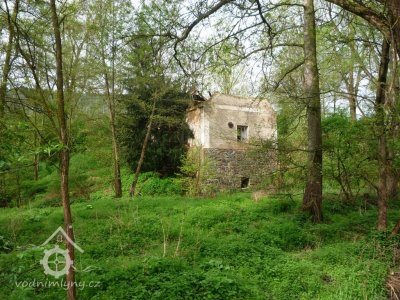 Rozpadající se budova bývalého mlýna pod rybníkem na Čelinském potoce.