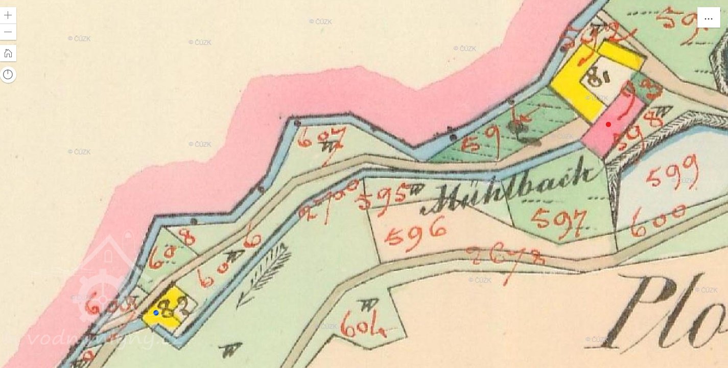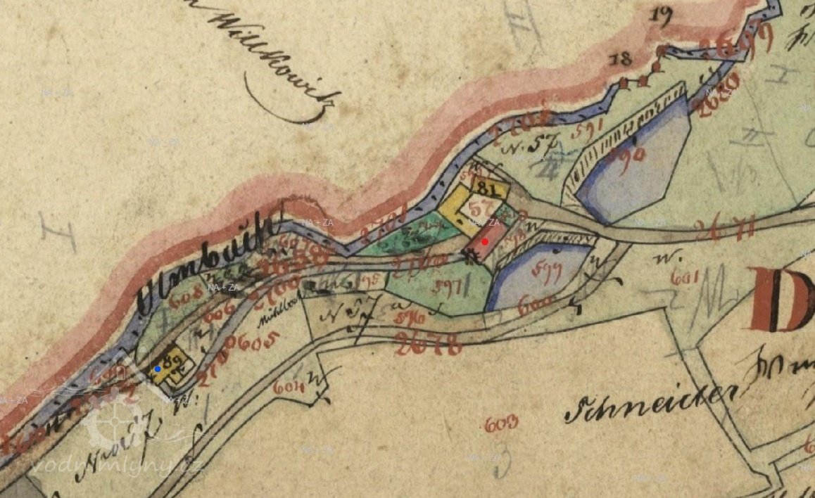 Popis1930 - 1 kolo na svrchní vodu, průtok 0,060 m3/s, spád 5,4 m, výkon 4,2 HP.